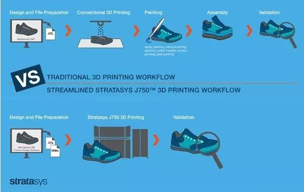 從上圖我們可以看到,J750只需一次打印作業就制造出了一只完整的運動鞋。“這款3D打印機最重要的一點就是突破了現實的門檻。”Stratasys公司首席商務官Josh Claman說。